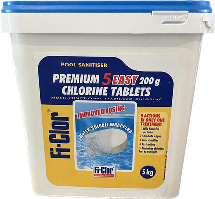 Fi-Clor Premium 5 Easy Chlorine Tablets are specially formulated to out-perform standard trichlor tablets, slowly realising a long lasting disinfectant to kill potentially harmful bacteria and other organisms. They also contain an algaecide to tackle the problem of green water and a clarifier to keep your water crystal clear. The pH properties of these tablets make it easier to balance the water in hard water areas and the product is stabilised to combat wasteful loss of chlorine to sunlight, making them ideal for outdoor pools.